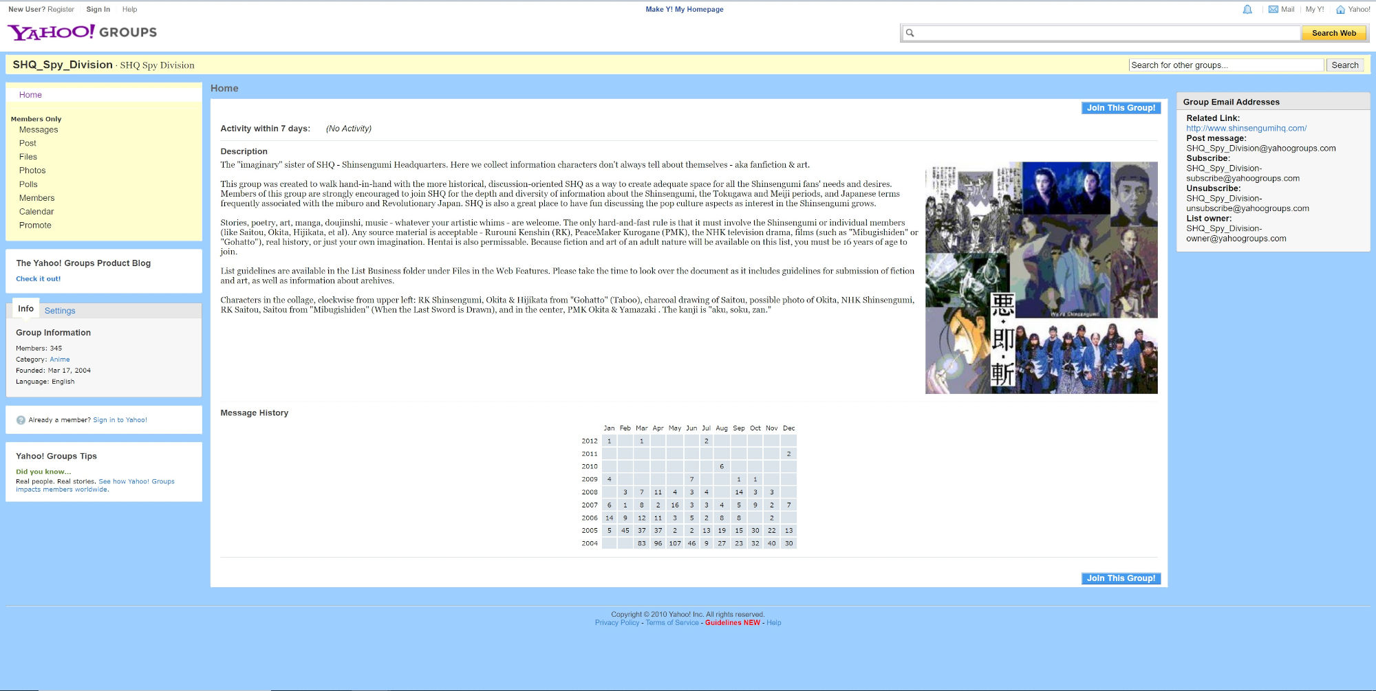 This group was created to walk hand-in-hand with the more historical, discussion-oriented SHQ as a way to create adequate space for all the Shinsengumi fans' needs and desires. Members of this group are strongly encouraged to join SHQ for the depth and diversity of information about the Shinsengumi, the Tokugawa and Meiji periods, and Japanese terms frequently associated with the miburo and Revolutionary Japan. SHQ is also a great place to have fun discussing the pop culture aspects as interest in the Shinsengumi grows.
